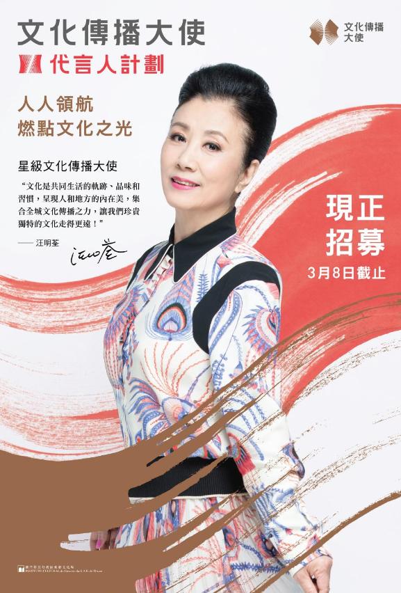 知名艺人汪明荃一直热心参与社会活动,积极支持文化事业,尤其为推动非物质文化遗产粤剧的传承及发展不遗余力,适逢今年是粤剧成功入选《人类非物质文化遗产代表作名录》10周年,文化局邀请汪明荃成为星级文化传播大使,联同艺人吴谨言、小肥、陈慧敏共同宣扬文化的传承与传播,呼吁更多人参与有关培训计划。对于文化,汪明荃认为 “文化是共同生活的轨迹、品味和习惯,呈现人和地方的内在美,集合全城文化传播之力,让我们珍贵独特的文化走得更远! ”。汪明荃同时担任 “星级讲堂”讲者,四月于郑家大屋为澳门市民开讲,传授粤剧知识与粤剧赏析,让更多人瞭解粤剧的魅力,届时罗家英亦作为演讲嘉宾出席活动。
