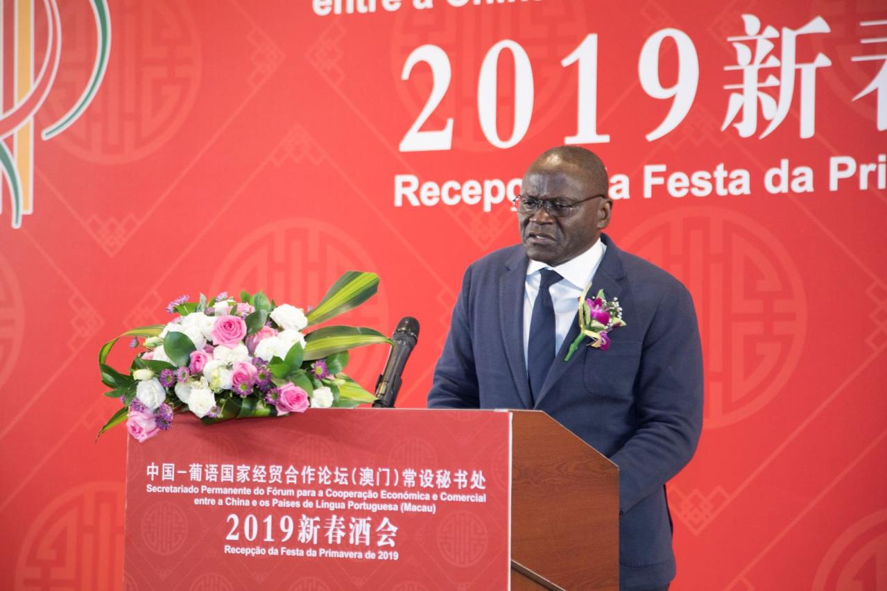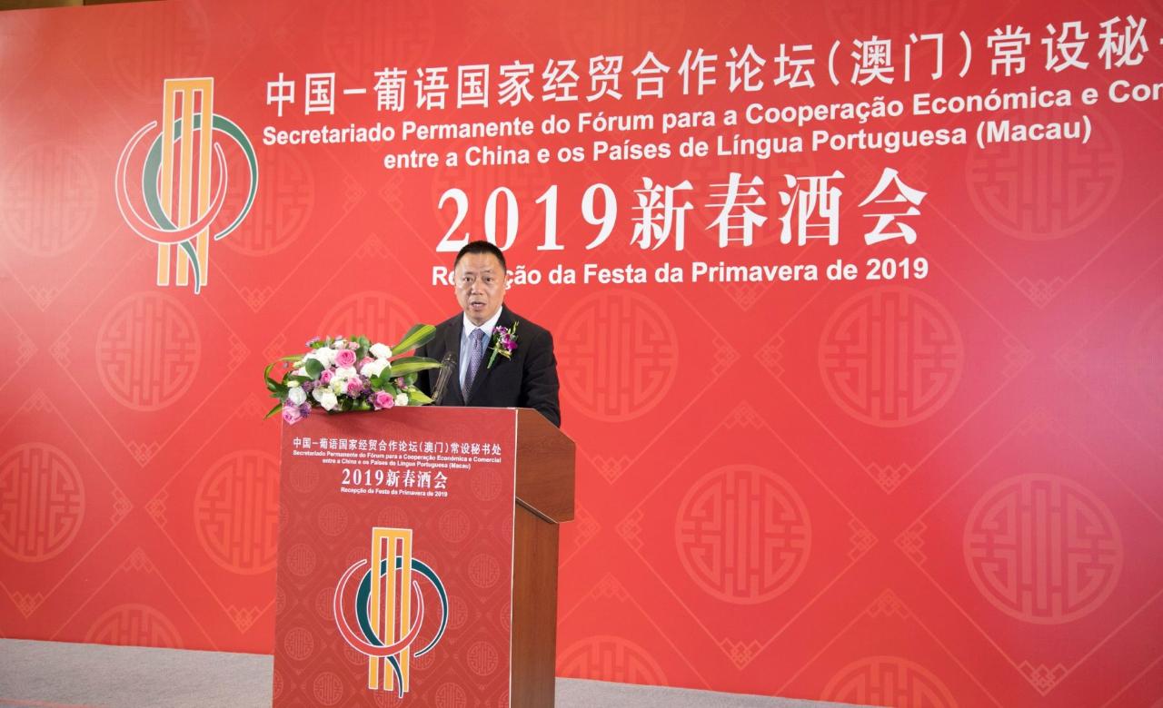 中国—葡语国家经贸合作论坛(澳门)常设秘书处于2月25日假北京东方君悦酒店举行新春酒会。中国商务部王炳南副部长、澳门特区政府经济财政司梁维特司长、参与论坛创立工作的商务部原副部长安民先生、陈健先生、葡语国家驻华使节、论坛中方后续行动委员会成员单位代表、中葡论坛常设秘书处前秘书长、有关省市港澳办、商务厅、中葡合作发展基金、中葡企业家联合会中方委员会会员企业、商协会、学术机构及媒体代表等200多人出席。徐迎真秘书长致欢迎辞,商务部王炳南副部长、澳门特区政府经济财政司梁维特司长以及葡语国家驻华使团团长几内亚比绍驻华大使马岚‧桑布分别致辞。