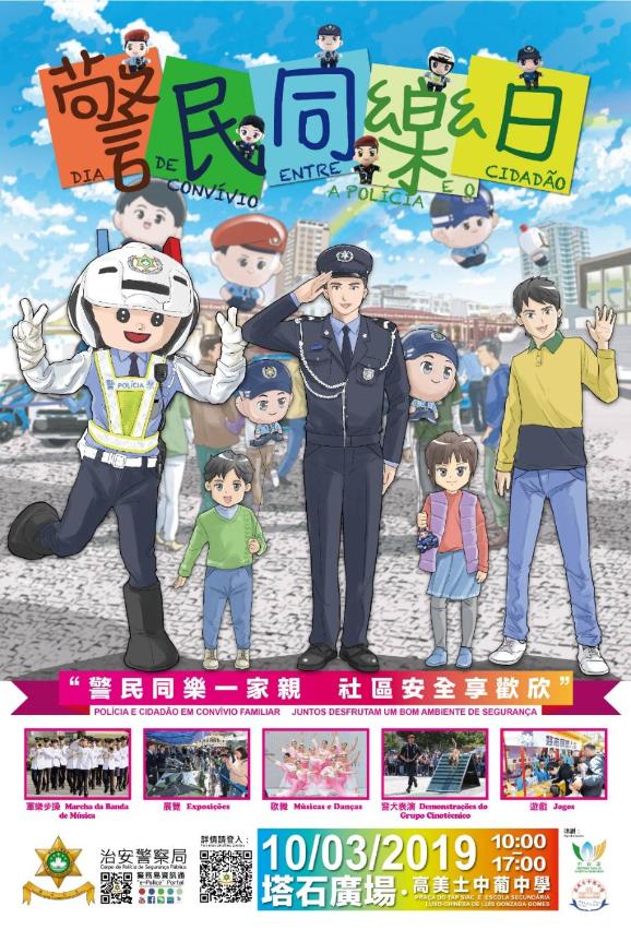 「警民同乐日2019」将继续假塔石广场及高美士中葡中学举行,活动当日上午10时将进行开幕仪式、表扬协助警方打击犯罪的好巿民、嘉奖在过去一年有杰出表现的警务人员、以颁发治安警察局举办的多个设计比赛、填色创作比赛的奖项。
