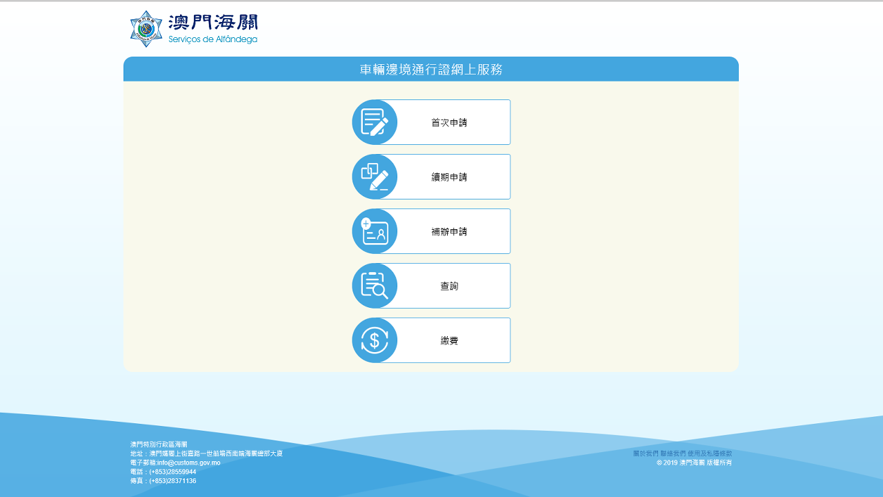 有关办理「车辆边境通行证网上服务」的详情,可浏览海关网页www.customs.gov.mo, 或于办公时间致电8490 0514、89894317查询。