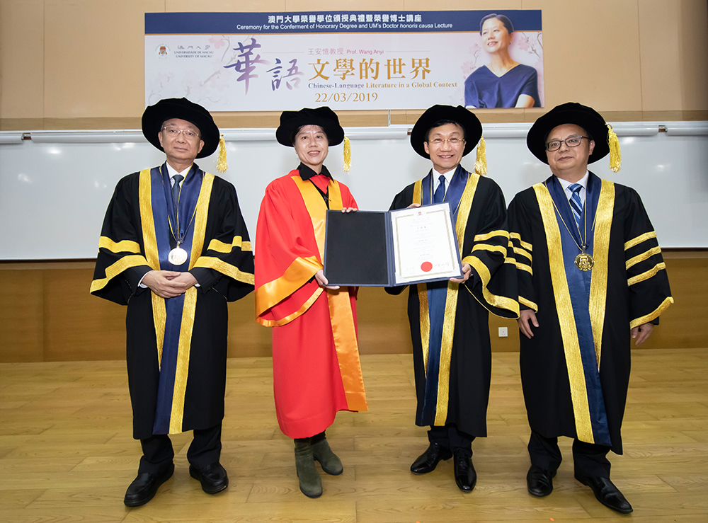 颁授典礼上,社会文化司司长谭俊荣在澳大校董会主席林金城和校长宋永华陪同下,向王安忆授予荣誉文学博士学位,以表彰其在文学创作上取得的重要成就,以及对世界汉语文坛所做出的杰出贡献。