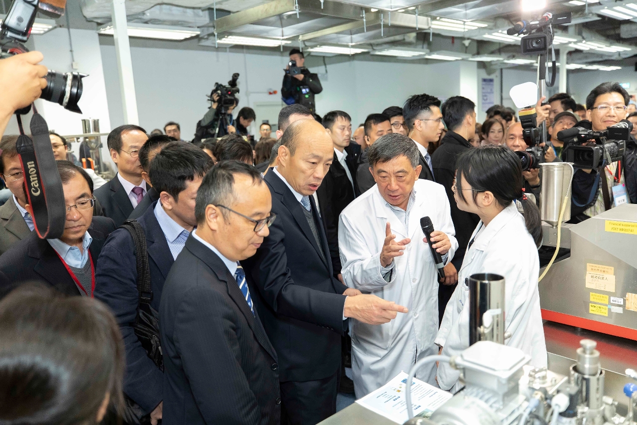 韩国瑜在宋永华和王一涛陪同下,参观了实验室多项先进仪器,期间又与师生交流。韩国瑜对实验室的创新研究非常感兴趣,对其中一项有助破损皮肤组织再生的杜仲敷料尤其赞赏,他说:「所有的知识产权都在自己手上,自己制造、自己申请专利,澳大的中华医药研究院很厉害。」