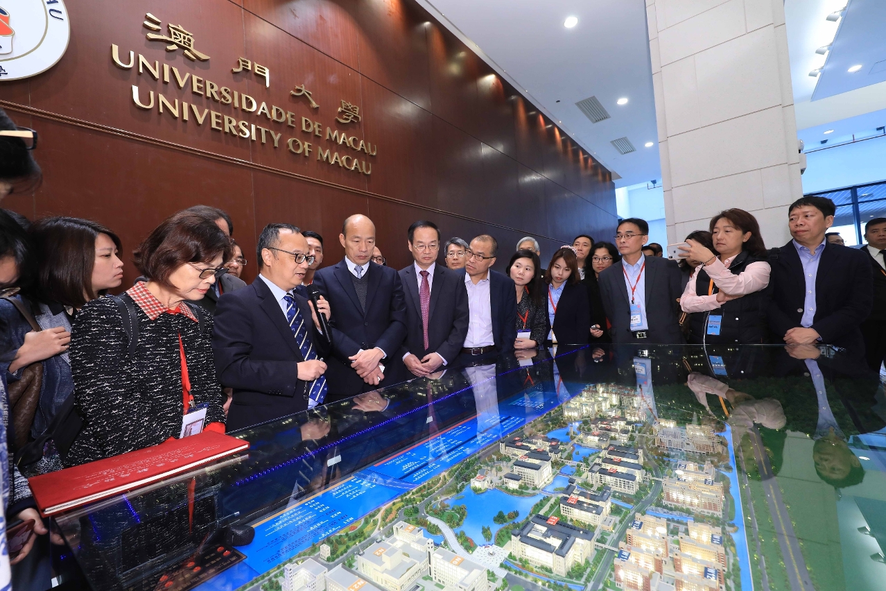 韩国瑜一行早上抵达澳大,获该校校长宋永华、副校长(研究)葛伟等热情接待。宋永华首先在澳大校园模型前,向韩国瑜介绍了澳大的历史、校园规划以及在澳门回归以来取得的卓越成果。宋永华表示,澳大是一所国际化的综合性大学,以英语教学为主,同时也着重中葡双语人才的培养,葡文系更是葡萄牙和巴西以外最大的葡萄牙语学术单位。澳大与全球超过33个国家和地区共217所高等院校签订合作协议,其中与台湾的高校也建立了合作关系。在澳门回归后,澳大做了大量的高等教育改革,使办学模式更与国际接轨,也加速了澳大的发展,以配合澳门特区的将来需要,尤其在国家和澳门特区政府支持下,澳大获批兴建新校园,引入亚洲最大规模的住宿式书院,实践全人教育,令澳大有更优越的空间发展,在培养人才和科研创新方面取得了飞跃的进步。