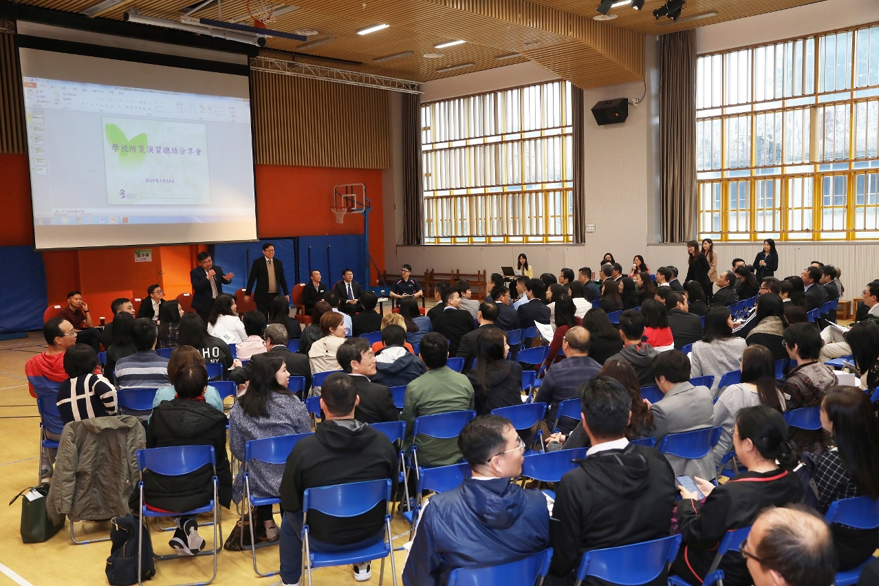 为了让学校分享防灾演习的经验,提升演习成效,教育暨青年局于2019年3月14日下午假何东中葡小学一楼综合运动室举行“学校防灾演习总结分享会”。教青局局长老柏生、副局长梁慧琪及龚志明,警察总局警司范家华、副警司张志辉,治安警察局警长陈晓宇,消防局副一等消防区长李梓豪、副消防区长张志明,地球物理暨气象局气象监察中心主任黄振星,教青局主管及77所学校领导和相关工作人员逾220人出席了分享会。