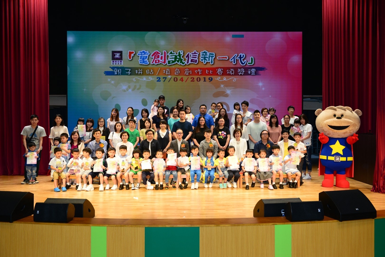 廉政公署“童创诚信新一代”亲子拼贴/填色创作比赛颁奖礼,于上周六(27日)下午3时假中葡职业技术学校礼堂举行,有逾180名学界代表、社团代表、家长及得奬者出席。廉政专员办公室主任沈伟强致辞时表示,这次活动反应理想,两个组别的参赛作品多达1,600份,当中不乏别具创意和启发性的作品,相信学生和家长在创作过程中,对廉洁和诚信有更深的领会,又勉励大家坚守这套价值观,并将之传递给家人及朋友,共建廉洁社会。