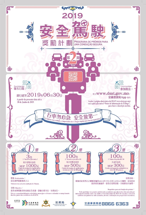 为鼓励及提醒驾驶者重视自身及他人安全,遵守交通规则,减少交通意外的发生。交通事务局、治安警察局及法务局续合办“安全驾驶奖励计划2019”,活动共分两期;第二期活动即日起接受报名,凡持有澳门驾驶执照人士可登入“交通资讯站”手机应用程式(App)或交通事务局网页www.dsat.gov.mo报名,截止日期为6月30日,欢迎踊跃参加。