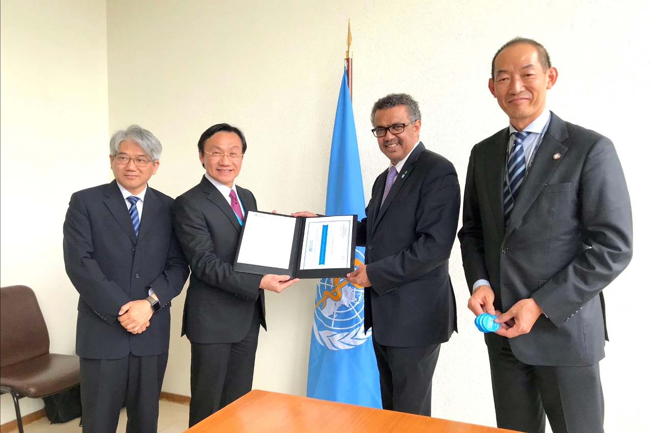 第72届世界卫生大会期间,世卫组织总干事谭德塞博士于5月24日在联合国日内瓦总部为中国国际应急医疗队(澳门)和中国国际应急医疗队(天津)两支队伍举行了认证授旗仪式,社会文化司司长谭俊荣与卫生局局长李展润应邀出席仪式并接受认可证书。