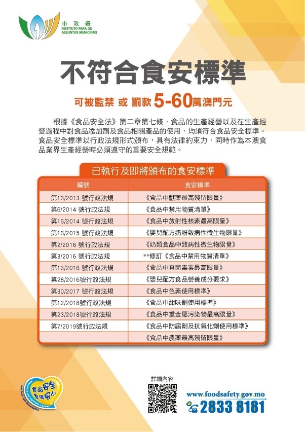 有关食品安全法、标准及指引的详细内容已上载至「食品安全资讯」网页www.foodsafety.gov.mo及「食安资讯App」,欢迎业界及市民浏览以瞭解更多。