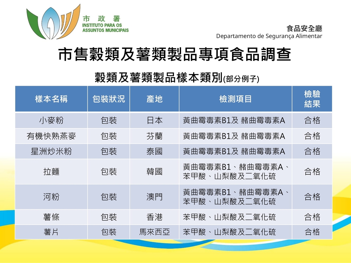 是次专项食品调查中,市政署分别抽查本澳百货公司、超级市场等店铺出售的谷类及薯类制品,并进行真菌毒素及食品添加剂的检测,包括黄曲霉毒素B1、赭曲霉毒素A、山梨酸、苯甲酸及二氧化硫。调查结果显示,所有样本均未见异常。