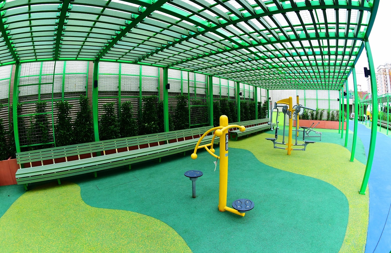 成人健身区:于缓步径沿线设置多种复合型成人健身器材,每组可供多人同时使用,并附以特色造型遮阳花架及座椅,为居民提供锻炼身体的优质设施。
