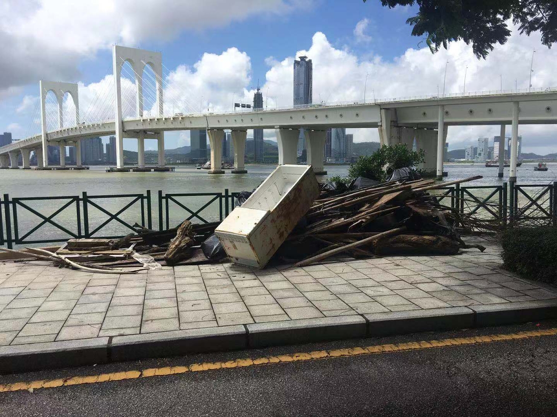 今日的潮汐上午至中午的预测潮高最低只有约一米,沿岸石滩和石堤有大部分面积露出水面,有利开展沿岸垃圾的清理工作。为此,海事局协调海上清洁的外判公司清理观光塔至西湾大桥一带沿岸石滩和石堤上的垃圾。清埋的垃圾主要包括木头、竹枝等植物,同时亦有生活垃圾,包括塑胶等,当中更有冰箱等大型生活用品。今日上午在石滩和石堤上共清理了约2吨垃圾。