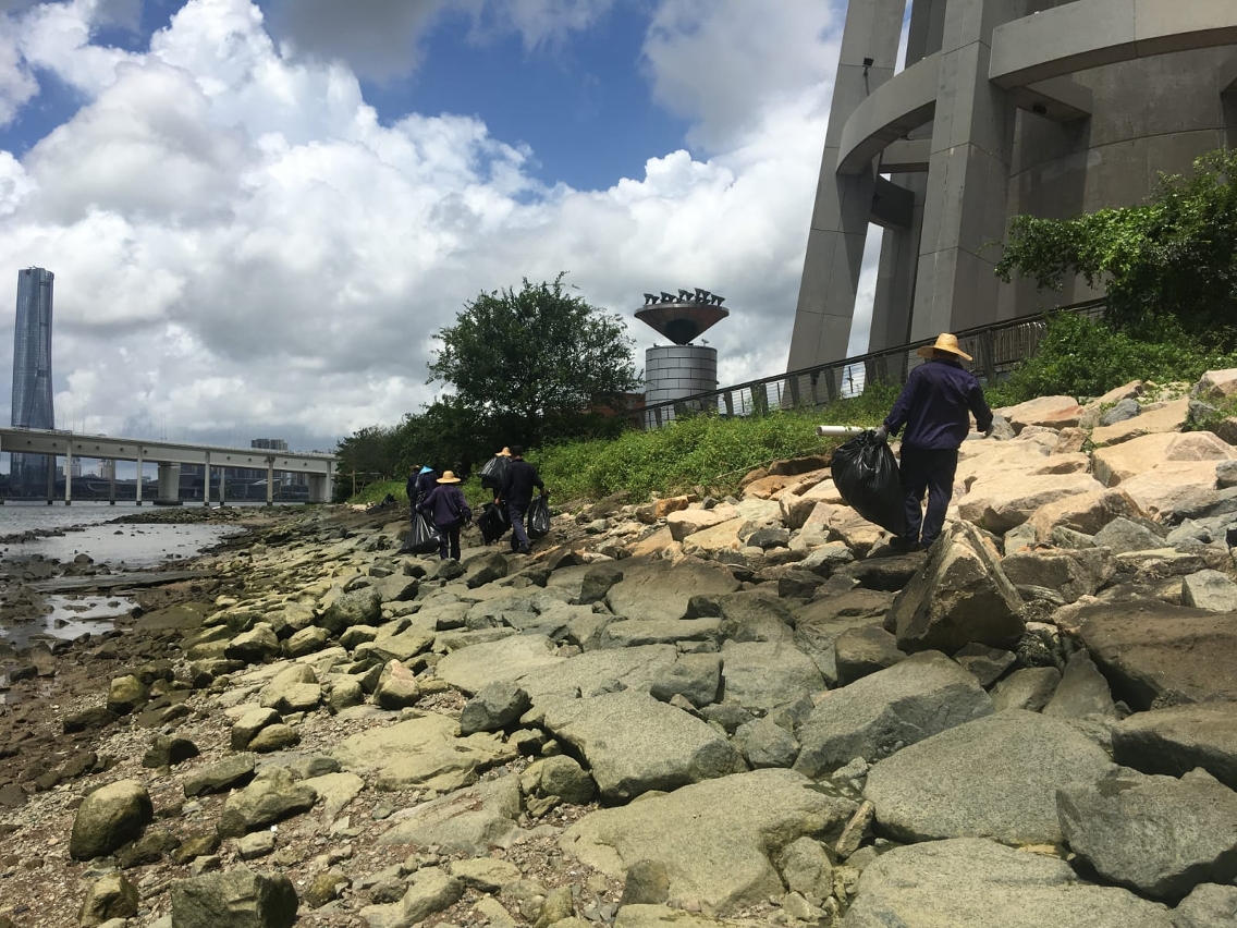 海事及水务局今日(27)协调清理观光塔至西湾大桥一带沿岸石滩和石堤上的垃圾,维护环境清洁。