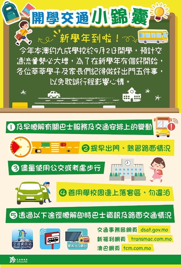 为便利市民大众掌握出行资讯,交通事务局会透过官方网页www.dsat.gov.mo、「交通资讯站」App及电台电视台等不同途径,适时加强交通讯息发布;呼吁广大市民留意及尽早瞭解新学年开学的巴士服务以至交通安排上的变动,提早出门;驾驶者要遵守交通规则,善用上落客区,切勿胡乱停泊车辆,阻碍交通。各巴士路线详情可浏览「巴士报站」App或相关巴士公司网页:新福利http://www.transmac.com.mo;澳巴http://www.tcm.com.mo 。