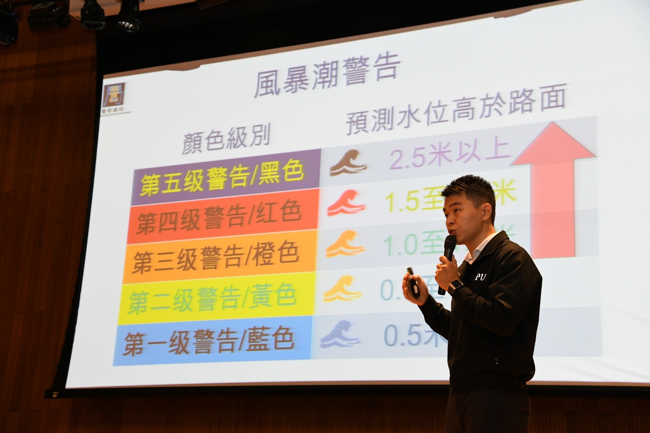活动在澳门大学学生活动中心剧场举行,警察总局人员首先透过短片及简报的形式,向学生介绍警察总局职能、民防体系协调机制、应急联动的功能及防灾避险知识等。随后,马耀权局长、吴锦华局长助理与学生展开热烈、轻松的互动交流。马耀权局长表示,2017年澳门遭受自1953年有纪录以来最强台风「天鸽」的吹袭,虽然民防架构成员全力应对,但仍给社会带来重大损失。特区政府检讨了民防体系应对台风的整个运作过程,认为政府、社会和居民在预防和应对危机和灾害方面存有不足之处,所以锐意改革民防体制、机制和法制,并推行了一系列完善措施。虽然在推进过程中充满着挑战,但民防架构各成员仍努力不懈,团结一致,克服各种困难,经过一年时间的奋斗,有效落实及完成了多项民防应急工作目标,并在去年9月应对另一个超强台风「山竹」取得相对理想的效果,将台风造成的伤亡和损失程度减至最低。而澳门大学及城市大学学生亦就民防工作义工培训、扩大风暴潮疏散撤离演习区域及有关《民防纲要法》立法事宜等问题与马耀权局长和吴锦华局长助理进行互动交流,场面气氛热烈。