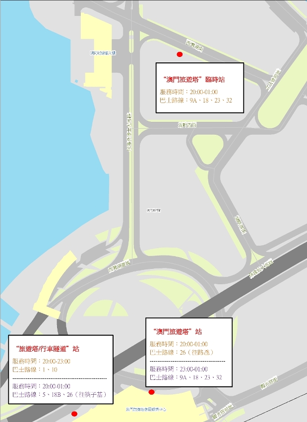另外,自晚上8时起,暂停使用“初级法院刑事大楼”站及原停靠于“澳门旅游塔”站及“旅游塔/行车隧道”站的5、9A、18、18B、23、26、32及32T路线巴士有所调整安排;且上述路线巴士于下午6时至凌晨零时会加密班次,当中18B路线巴士尾班车延长至晚上11时开出。巴士公司将因应现场客流状况,适时增设点对点服务的特班车,以疏导乘客。
