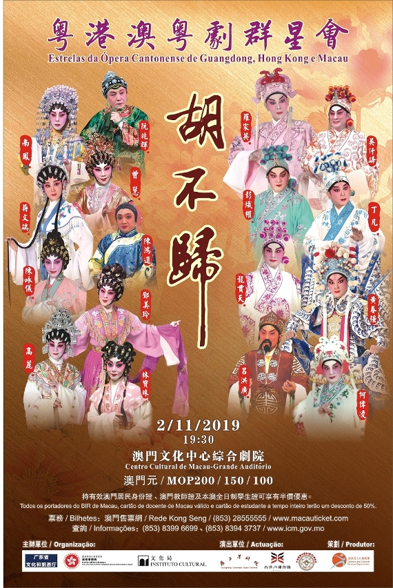 为弘扬粤剧南国红豆的传统艺术,加强粤港澳三地文化交流,由广东省文化和旅游厅、香港民政事务局及澳门文化局联合主办,香港康乐及文化事务署策划,广东粤剧院、香港八和会馆、中国戏剧曲艺家(澳门)联谊会三地红伶担任演出之粤港澳文化交流活动《粤港澳粤剧群星会》,将于11月2日(星期六)晚上7时30分在澳门文化中心综合剧院上演传统名剧《胡不归》,由三地粤剧界殿堂级红伶合作演出,门票现正于澳门售票网公开发售。