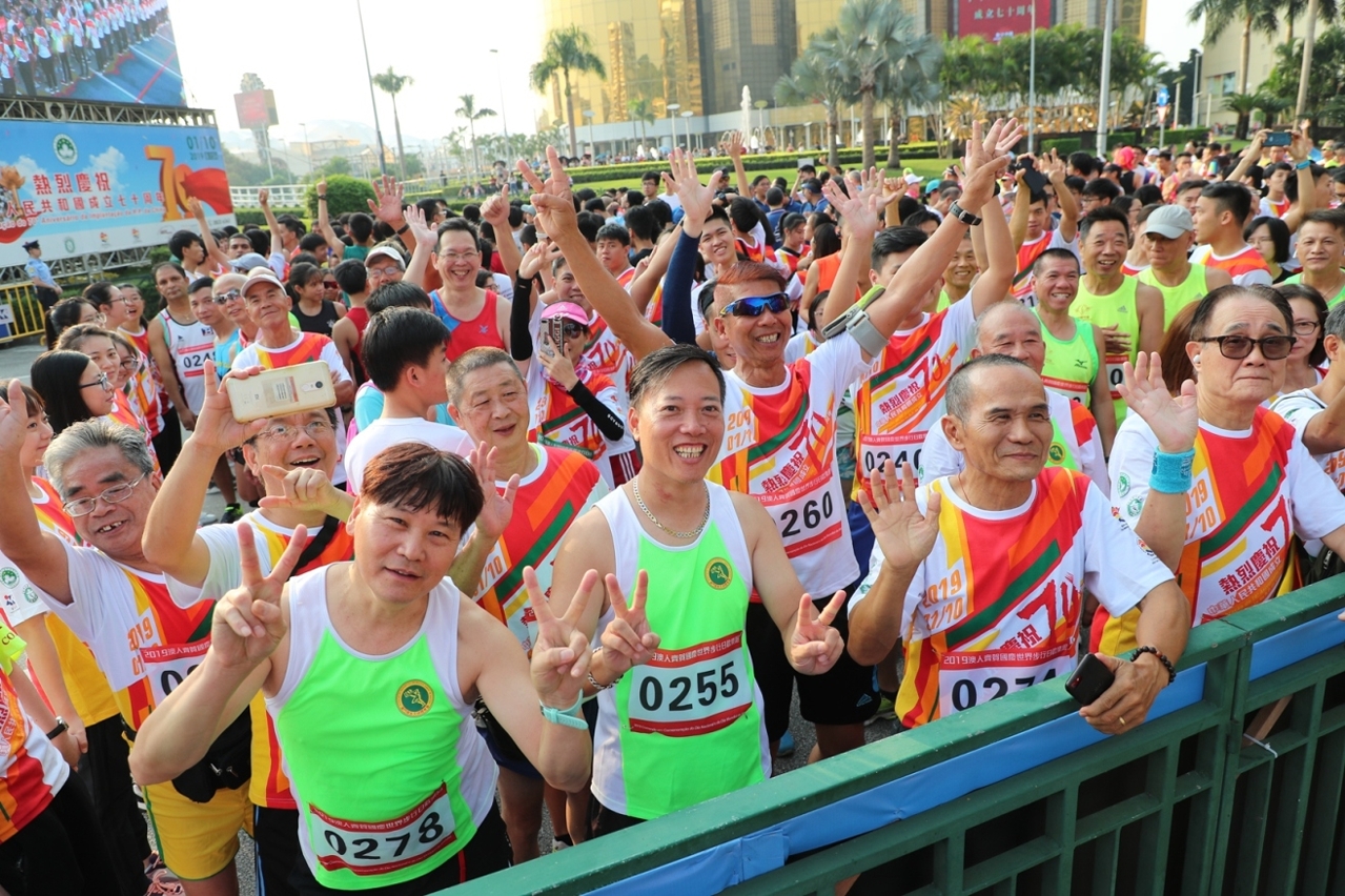 由澳门特别行政区政府主办、体育局承办、中国澳门田径总会协办之“2019澳人齐贺国庆世界步行日欢乐跑”活动,今日(1日)上午八时十五分于金莲花广场前举行,由澳门特别行政区代理行政长官黄少泽先生主持起步礼,吸引一万八千名参加者在礼炮声中愉快地起步。