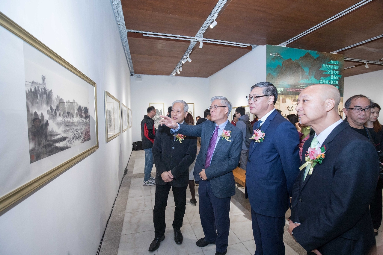 由文化局主办的“2017年澳门书画联展评审大奖艺术家谭植桓、刘春红作品展”今日(12月6日)在龙环葡韵汇艺廊举行开幕式,文化局副局长陈继春、澳门美术协会会长陆曦、澳门颐园书画会常务副会长萧春源,以及是次参展本地艺术家谭植桓及刘春红主礼,场面热闹。