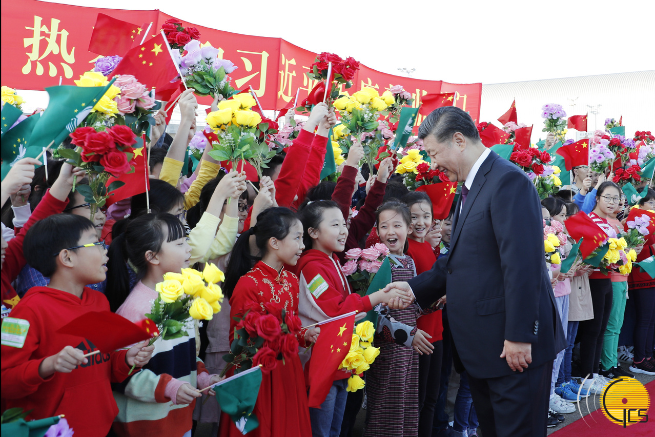 习近平主席一行乘坐的专机于下午4时许抵达澳门国际机场,航机停在停机坪后,行政长官崔世安伉俪登上机舱迎请。习近平及夫人彭丽媛下机后,接受劳校一双男女小学生献花,并沿红地毡与在场迎接的各主要官员握手。现场设有警察银乐队奏乐,约400名手持国旗、区旗和绢花的大、中、小学生热烈欢迎,习近平伉俪频向迎迓群众挥手。