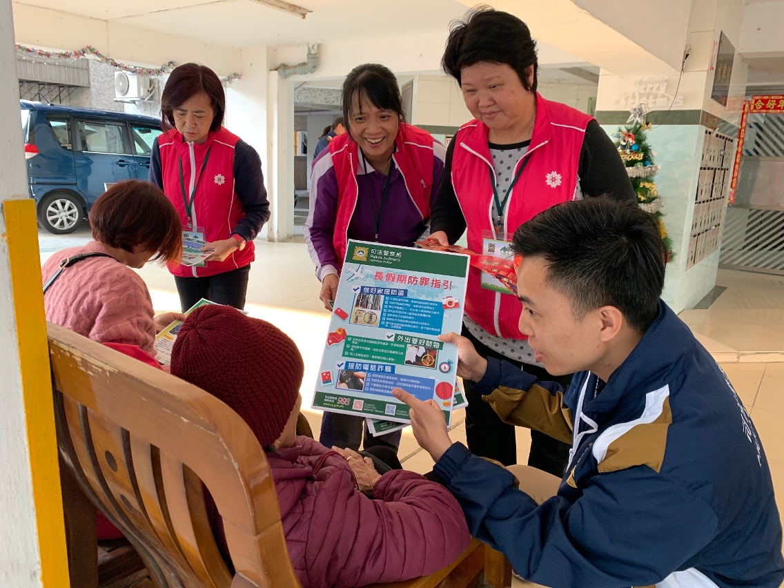 此外,司警局人员还先后联同上述社团代表及“司警局大厦防罪之友"会员巡查社区治安黑点,以及到各区的住宅和工业大厦、休憩区、巴士站及商铺进行冬防宣传,向居民、商户和物业管理人员讲解冬防资讯并瞭解区内的治安情况。司警局人员特别提醒居民在节假日期间须做好家居防盗措施,前往人多挤迫地方时应注意安全,保管好个人财物;呼吁大厦管理人员加强大厦保安工作,如发现或怀疑犯罪,应马上向警方举报。