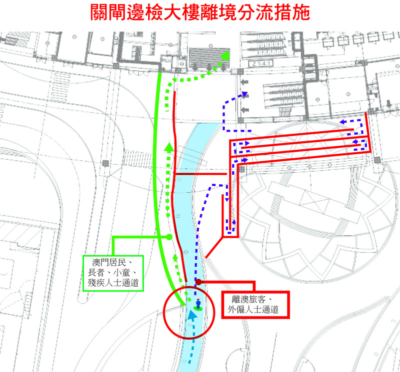 当离境大堂接近饱和时,关闸广场风雨廊路段,会实施“分流及分段放行”的措施(附图六),临时封闭该走廊两边,在特定位置设立出入口。澳门居民、六十五岁或以上长者、孕妇、伤残人士和三岁及以下小童,将因应实际情况,安排使用其中一条专用队列,而其余旅客包括外雇人士则使用另一队列。