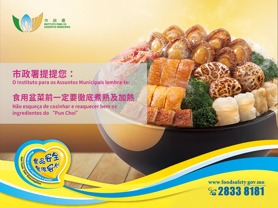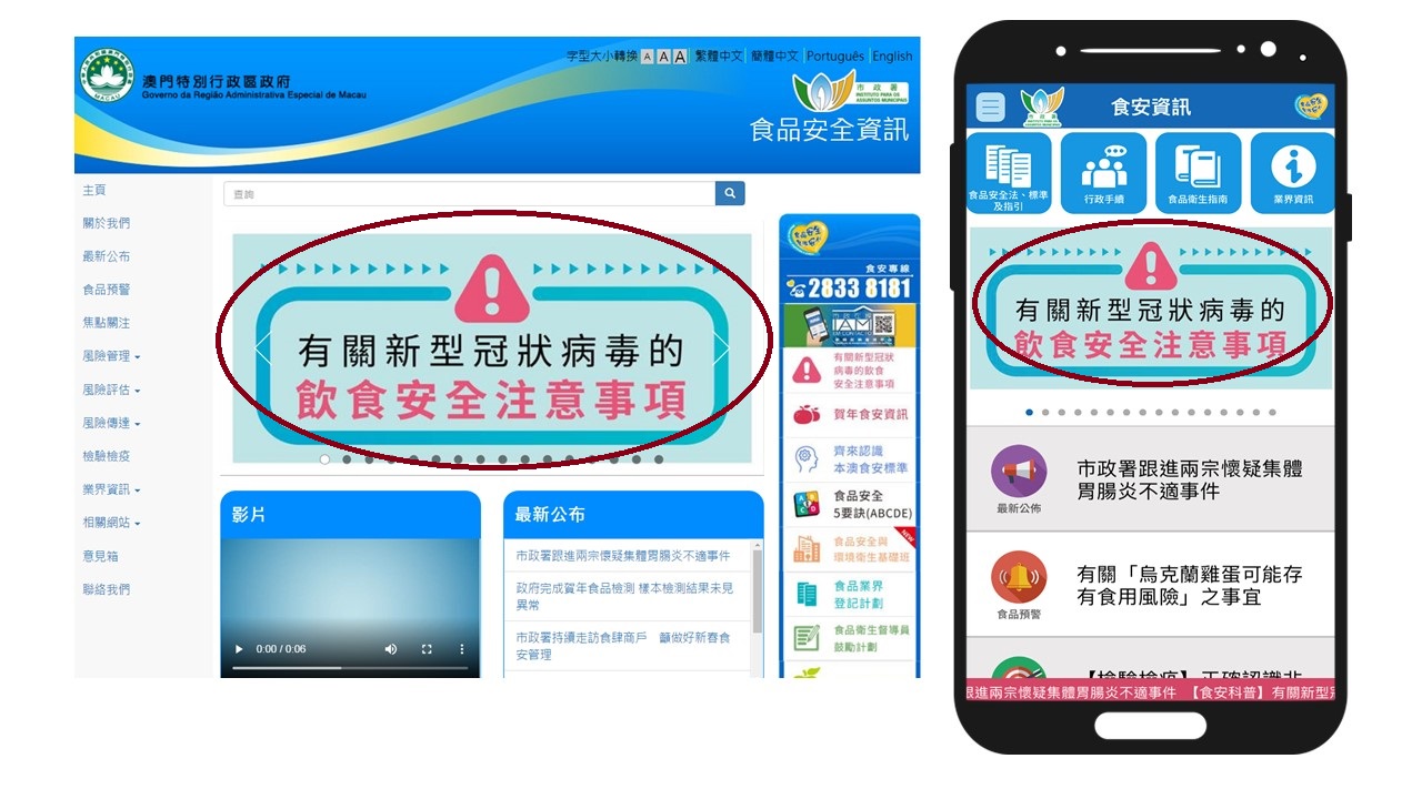 市政署已于食品安全资讯网开设「贺年食安资讯」及「有关新型冠状病毒的饮食安全注意事项」专页,公众可登入www.foodsafety.gov.mo或下载「食安资讯」手机应用程式,获取一系列资讯。