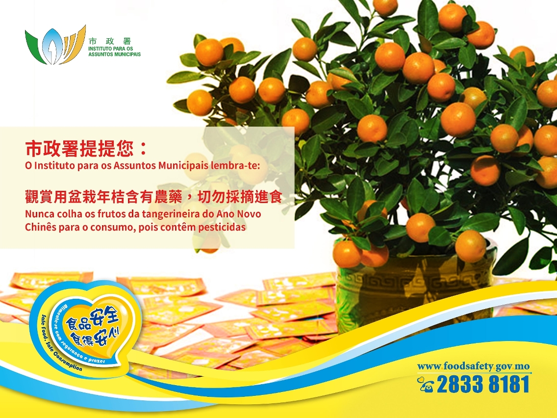 春节期间,由于对蔬菜及肉类需求增加,市政署特别提醒公众切勿私自携带依法须受检疫而未经检疫的肉类及鲜活食品入境,避免触犯相关法例,共同保障食品安全及卫生防疫。市民在欢度佳节的同时,亦需注意食品安全及个人卫生,进食前应用皂液及清水彻底清洗双手,共餐时宜使用公筷、公匙;生熟食品应分开处理,在处理生食和熟食之间要洗手,避免交叉污染;更要确保食物彻底煮熟及加热方可进食,如对食物卫生状况及品质有疑虑应停止食用。市民外出用餐时,应选择有良好卫生环境及具信誉的商户,切勿光顾街边的无牌摊贩及来源不明的食品。而用于布置环境的观赏性年桔并非为食用而栽种,在裁种或上市前通常施上农药,所以切勿采摘食用或腌制食用。