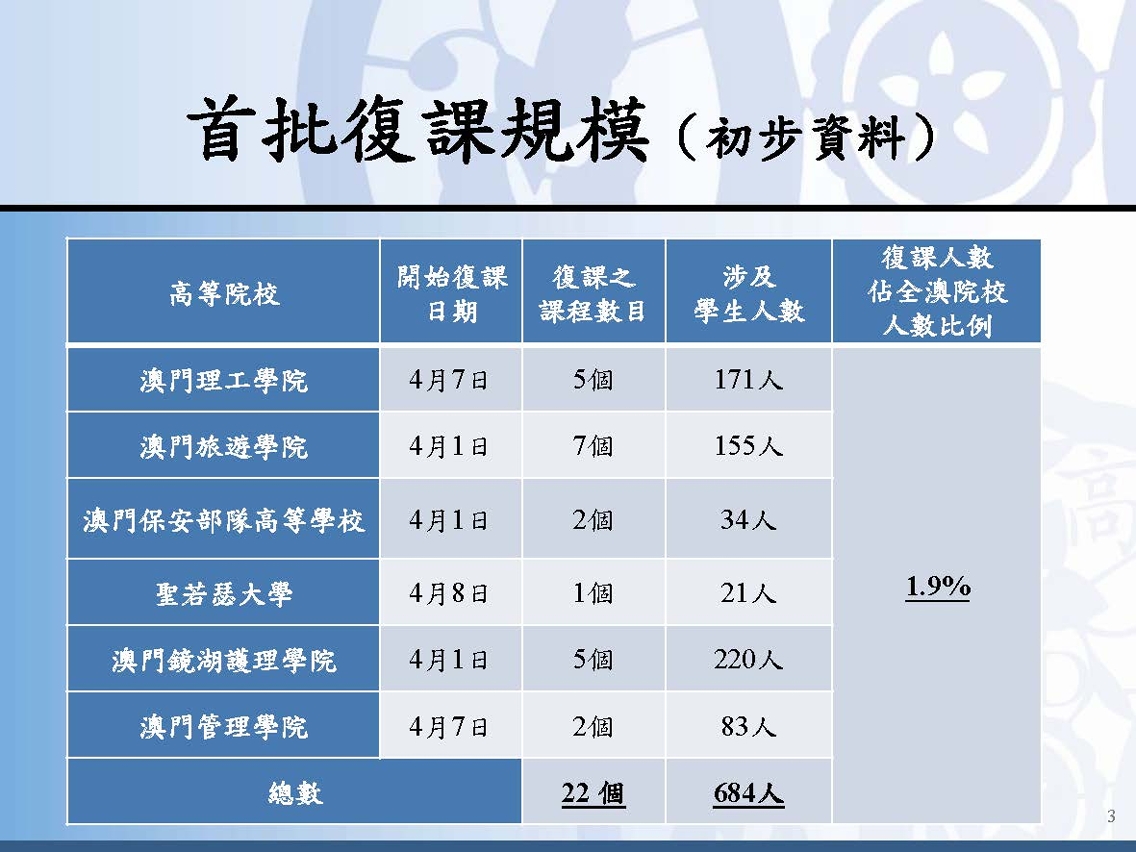 4月1日开始复课的院校包括澳门旅游学院、澳门保安部队高等学校及澳门镜湖护理学院,共有14个班级,涉及409位学生。4月7日开始复课的院校包括澳门理工学院、澳门管理学院共有7个班级,涉及254位学生。另外,圣若瑟大学会在4月8日开始复课,共1个班级,涉及21人。