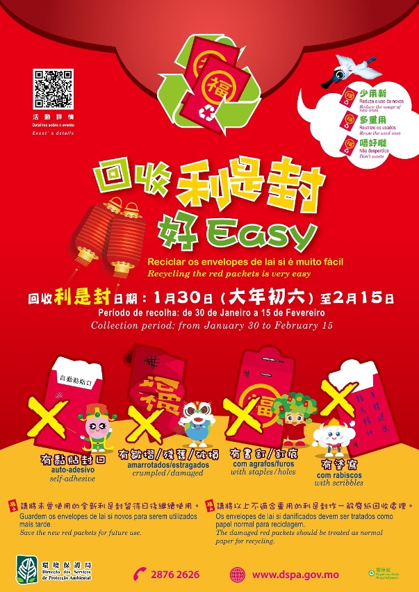 环境保护局于今年新春期间续举办“回收利是封好EASY”活动,已于2月15日结束。尽管受疫情影响,仍获市民及社会各界的广泛支持及参与。是次活动在全澳各区设置了超过800个回收点,共回收近51万个利是封(超过1.5吨),估计减少砍伐20棵树,经分选后,可重用的利是封约23万个(约0.7吨)。