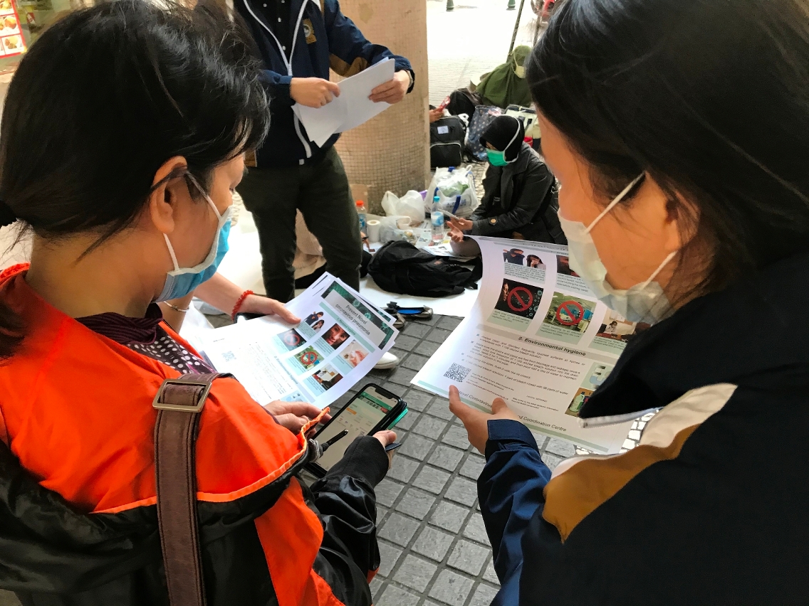 复活节假期期间,本局大厦罪案预防小组联同外劳中介职业协会会长欧阳广球等人员一同到新桥区及三盏灯一带较多外雇聚集的休憩区进行巡访,呼吁外雇戴口罩、勤洗手,减少同乡聚会、保持社交距离,并介绍特区政府发布抗疫资讯的渠道,建议他们将有关资讯透过网络社交平台分享给朋友,大家共同做好抗疫工作。