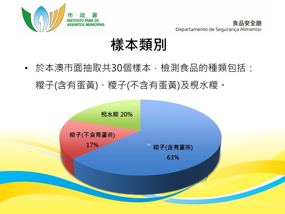 本次抽查的食品样本包括传统肉糉、素糉及枧水糉等共三十件,分别进行了微生物检测包括沙门氏菌、金黄色葡萄球菌、蠟样芽胞杆菌,以及化学检测包括硼砂或硼酸、苏丹红(仅限含蛋黄的样本)。根据化验结果显示,所有样本的微生物及化学检测结果均未见异常。