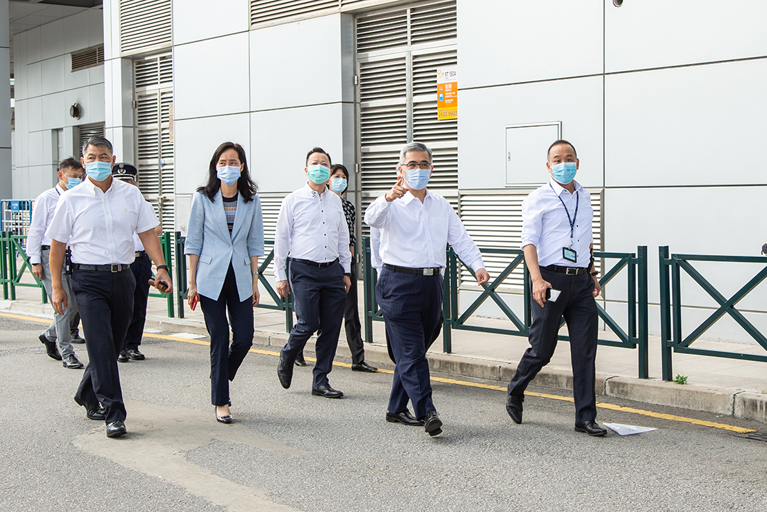 两司长及一行官员首先视察了关闸广场离境人流的管理措施,并瞭解通关人士转换健康码及离境大堂检查健康码的分流情况,以及就市民和外地雇员转码后的通关便利,提出了优化建议。