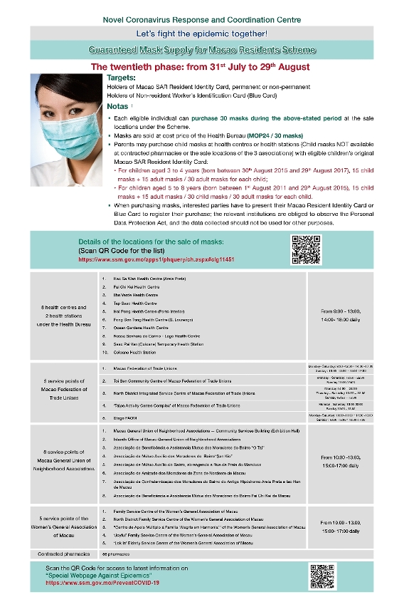 新型冠状病毒感染应变协调中心今(29)日公布,第二十轮保障口罩供应澳门居民计划于周五(31)日开始。为方便市民,当局调整口罩售卖期间至30日,即第二十轮计划由7月31日至8月29日,期间每人一次性购买30个口罩,售价维持每个0.8澳门元,即共24澳门元。应变协调中心强调,特区政府保证口罩供应充足,市民在第二十轮计划期间的任何时间都可购买到口罩,呼吁市民毋需急于首两日前往购买,以避免人群聚集,届时亦无需长时间轮候,希望市民配合。