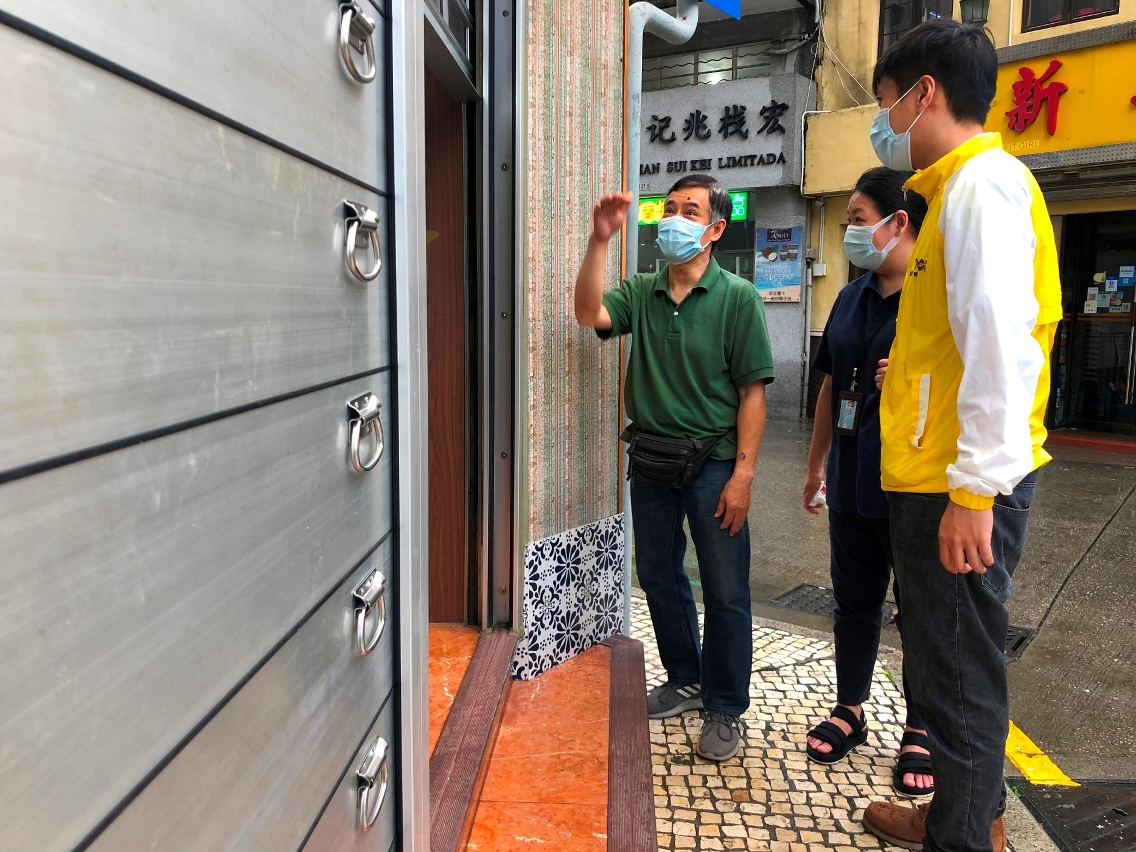 经济局联同生产力暨科技转移中心人员今(19)日下午到内港以及十月初五街一带走访,瞭解已安装防洪门或升降台的商户的情况以及防浸设备的功效。