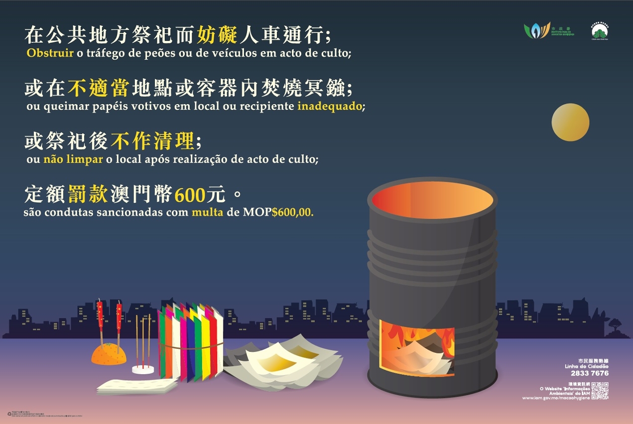 随着社会发展,市民在保留传统习俗的同时,亦可考虑更环保、节约的祭祀模式,如减少祭品及冥镪数量,以减少祭祀过程产生的烟气,尽量减低对附近居民及行人的影响,共同为保护环境出一分力。若市民有任何疑问,欢迎致电市政署市民服务热线2833 7676查询。