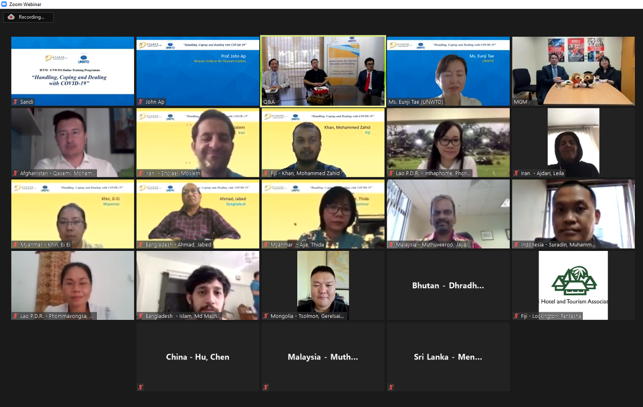 澳门旅游学院世界旅游教育及培训中心与联合国世界旅游组织合作举办了首个网上培训课程,课程以「新型冠状病毒的应付、应对及处理」为主题,讲述在新型冠状病毒大流行的情况下,在可持续旅游政策与规划、目的地管理、 营销策略及人力资源管理四方面应对上的观点。课程于2020年7月下旬举行,以代替原定学员来澳学习8天的第9届澳门旅游学院世界旅游教育及培训中心与联合国世界旅游组织合办的培训课程。