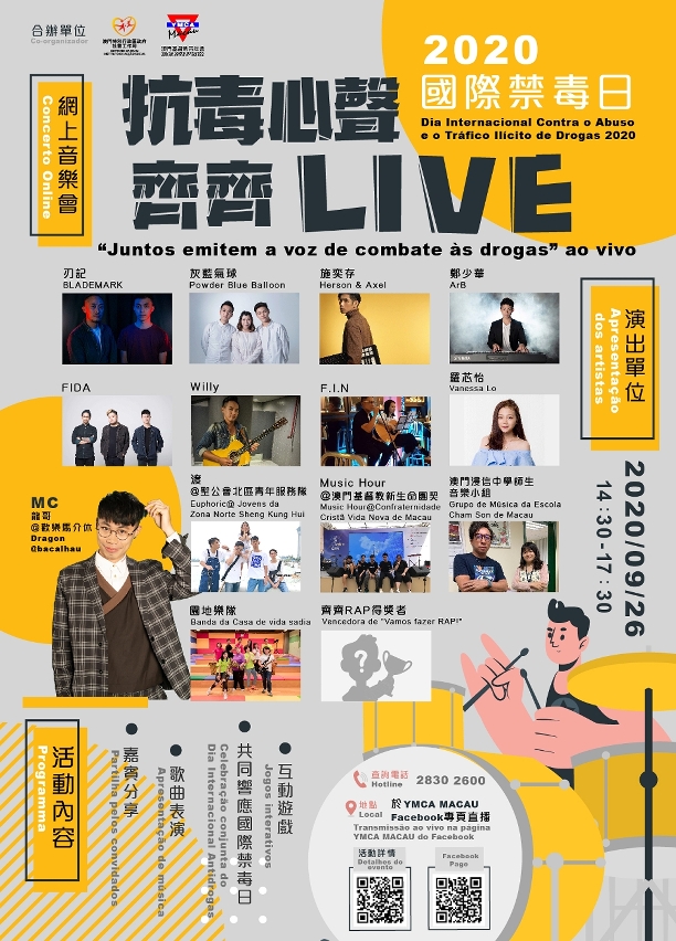 为响应2020国际禁毒日,社会工作局与澳门基督教青年会合办“抗毒心声齐齐LIVE”, 将于9月26日下午在网上直播,通过音乐向市民传递健康无毒的生活态度。
