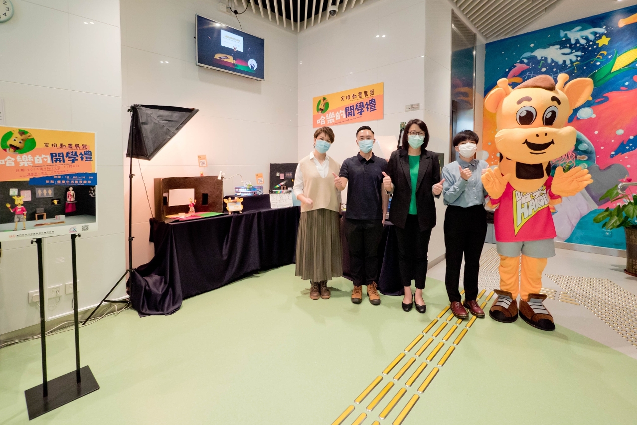 “哈乐的开学礼–定格动画展览”由社会工作局许华宝副局长、防治赌毒成瘾厅郑耀达厅长、四月工作室陈庭婷女士及芸悦手作工作室梁笑东女士主持亮灯开幕仪式。