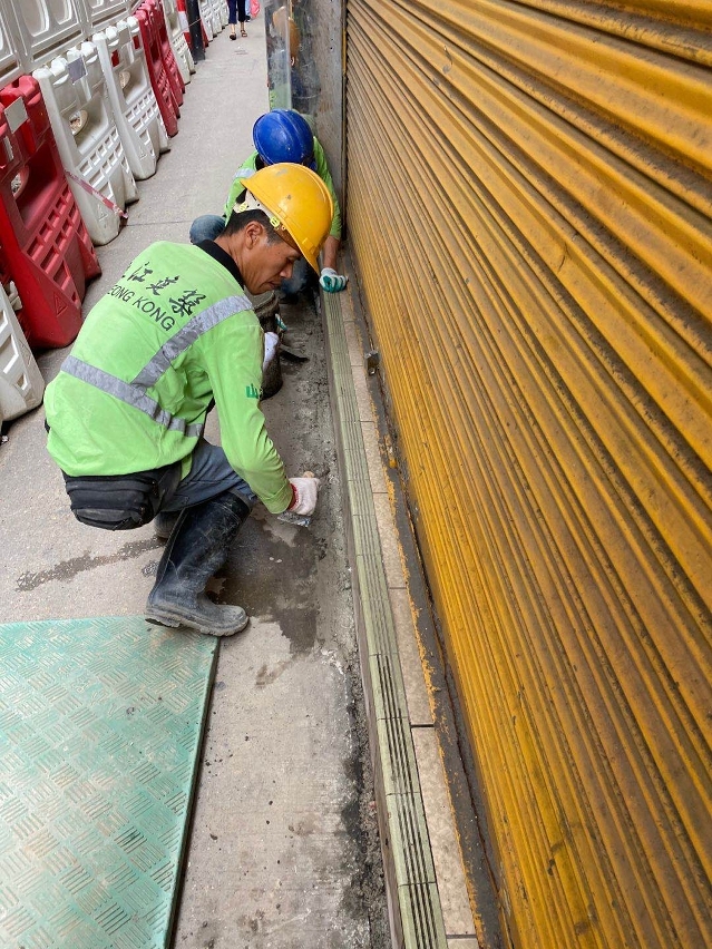 由于工程位于铺设大量地下管线的建成区内,而且工程施工范围较大,需要于较深的地下空间铺设新的排水渠,故两旁行人道出现轻微沉降,市政署在工程设计时已备应对预案,在沉降出现后即派员到场检测,沉降属轻微及正常,对周边大厦及商铺不构成安全影响。市政署已启动有关应对预案,并已要求承建商对沉降路面进行临时修补,亦有助降低天雨导致水土流失的情况。待渠道工程完成后,将按原计划重铺两旁行人道。