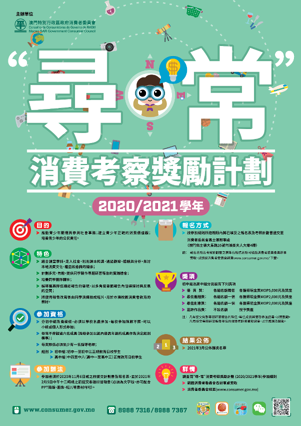 为培养青少年正确的消费公民意识,消费者委员会以中学生为对象举办的“寻・常”消费考察奖励计划(2020/2021学年)现正接受报名,为让有意参加的各校师生瞭解“寻・常”计划的核心价值及目的,消委会于10月13日(周二)及16日(周五)下午五时举办两场说明会,欢迎各校预约派员参加。