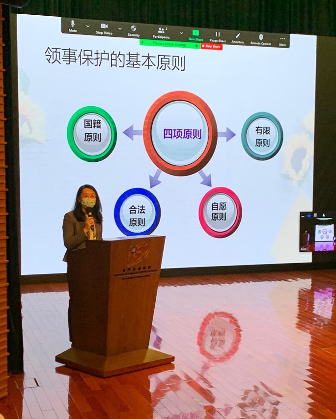 黄处长向学生讲解澳门居民的组成、其基本权利与义务,以及国籍法在澳门特区的实施情况等。而李副主任介绍我国外交部领事司在领事保护与领事服务上的主要工作,包括驻外国领事馆如何协助中国公民解决在国外遇到各种不同的事故和问题,如何保护中国公民在国外的合法权益。此外,她还举了实例指出当中国公民在其他国家发生自然灾害或局势动荡时,我国外交部曾多次起动了大规模撤离当地中国公民和华侨的紧急措施,体现出国家永远是我们最大的后盾,以及在国际上突出大国外交的力量。此外,她也提醒学生身在外地时必须遵守当地法律,尊重当地宗教礼节和文化等,以及呼吁学生在外地时需防范各类安全风险和提高防范意识,并向学生推介了外交部全球领事保护与服务应急呼叫服务的联络方式。在回答学生有关目前国外新冠疫情下到海外交流及活动的问题时,李副主任建议学生们在严格防疫常态化之下要减少出行出境,才能降低感染风险。