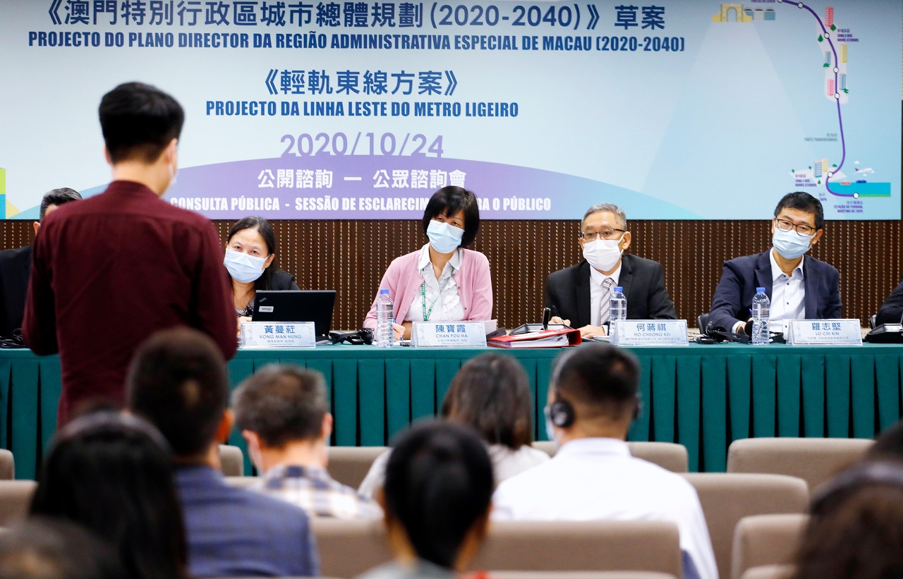 《澳门特别行政区城市总体规划(2020-2040)》草案及《轻轨东线方案》今(24)日于马交石炮台马路33号5楼多功能厅举行第四场公众咨询会,约100位市民参加,主要关注环境保护及生态、文化遗产及景观保护、增设文化设施,以及公共开放空间和运动设施等。
