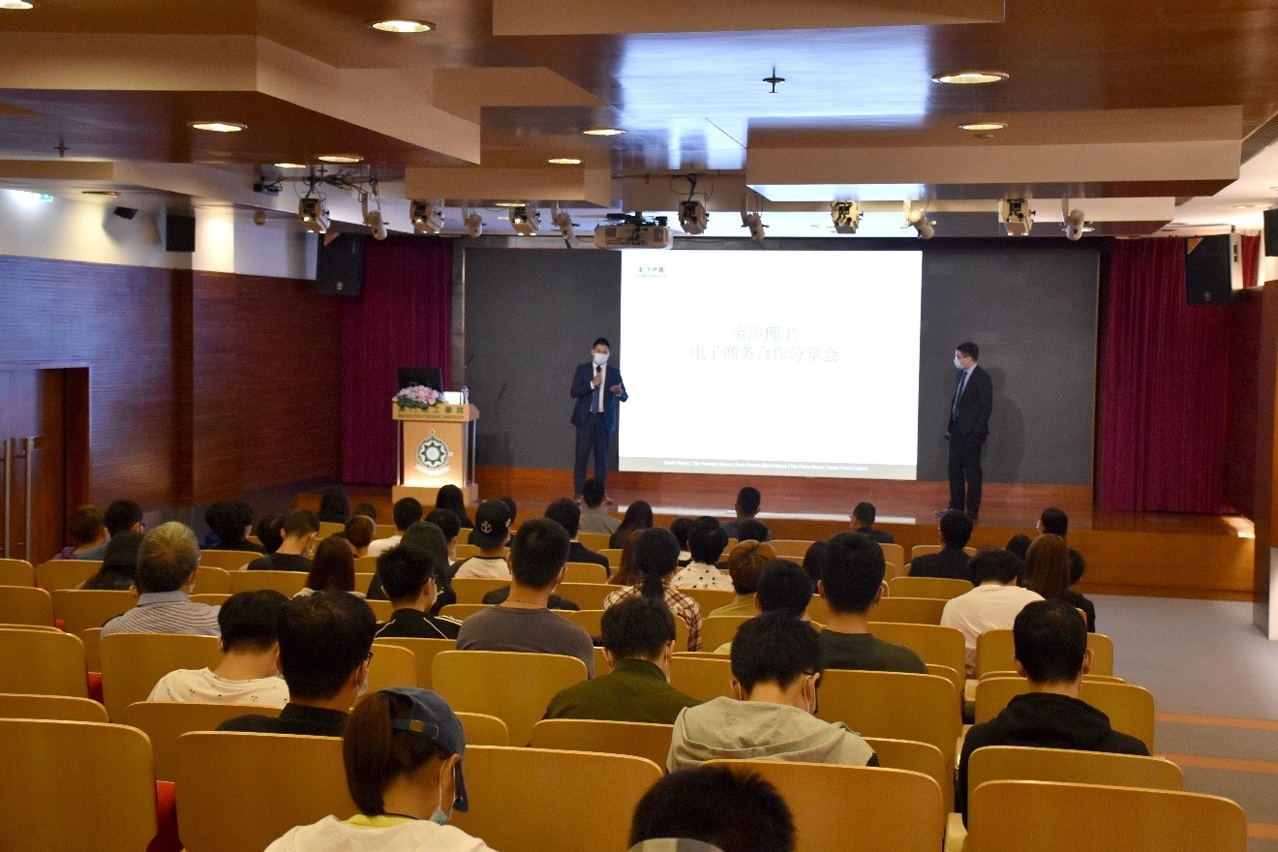澳门理工学院管理科学高等学校与金沙中国于日前举办 “电子商务合作分享会”,当天金沙中国出席嘉宾有:人力资源副总裁张国军、副总监伍家愉、经理Sonia Da Conceicao、数字营销及电子商务部行政总监钟俊杰等。澳门理工学院出席代表有:管理科学高等学校校长黄贵海、学术事务部代部长张咏蓝、学生事务处处长刘颖欣、电子商务学士学位课程主任黎秀龄等。两位任职金沙中国综合渡假村业务分析师的理工电子商务校友黄梓峰及贺明扬,则分享他们从校园走进职场的心路历程。连同电子商务学士学位课程的师生,共有八十多人出席是次分享会。