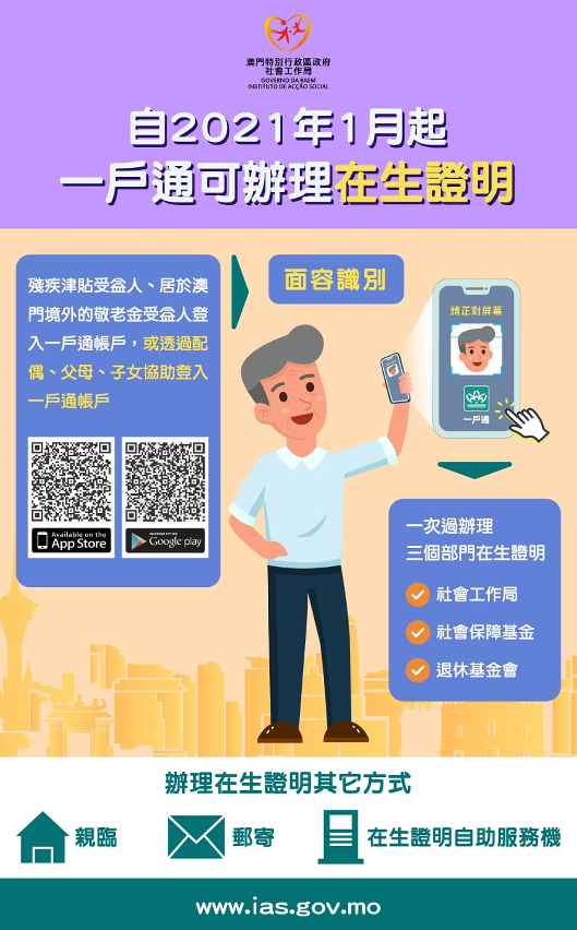 社会工作局为配合特区政府持续推行电子政务,以便为市民提供更优质便捷的服务。从2021年1月1日上午9时起,凡残疾津贴受益人、居于澳门以外地区的敬老金受益人,可于一户通进行面容识别以办理在生证明手续。