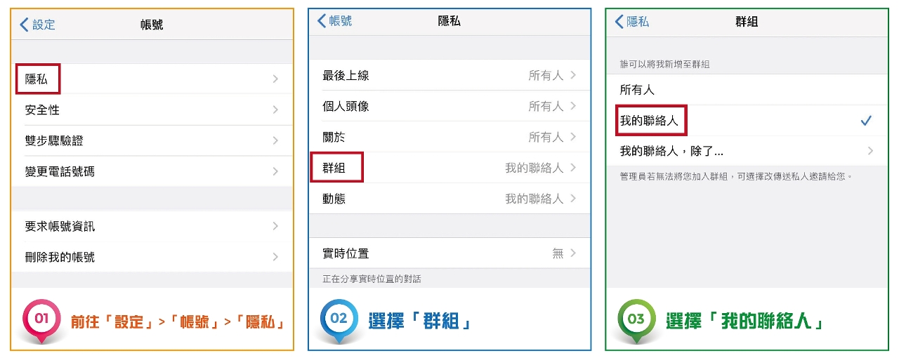 1. 为防“Whatsapp”帐号被人利用并拉入陌生群组,建议市民根据以下步骤设置“Whatsapp”的“隐私”设定,以提升帐号安全:在“Whatsapp”内打开“设定”→选择“隐私”→选择“群组”→选择“我的联络人”,即可完成;