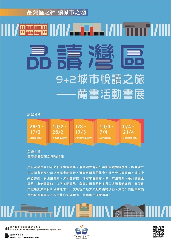 澳门公共图书馆从粤港澳多个城市的公共图书馆之荐书名单中选取约60本馆藏,并连同各地图书馆捐赠之地方文献,进行“品读湾区”9+2城市悦读之旅荐书活动书展,并在多所公共图书馆巡回展出共约80本图书,类型众多,内容丰富,包括名家经典、地方风貌、小说文学、童书绘本、历史传记、哲学理论等,为读者提供知识养分。
