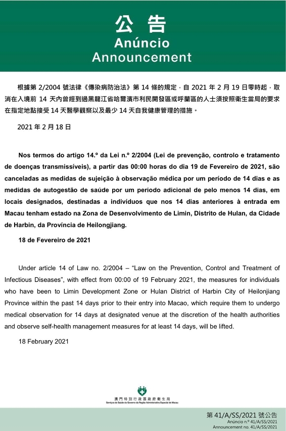 新型冠状病毒感染应变协调中心宣布,因应黑龙江省的疫情变化,根据第2/2004号法律《传染病防治法》第14条的规定,自2021年2月19日零时起,取消在入境前14天内曾经到过黑龙江省哈尔滨市利民开发区或呼兰区的人士须按照卫生当局的要求在指定地点接受14天医学观察以及最少14天自我健康管理的措施。
