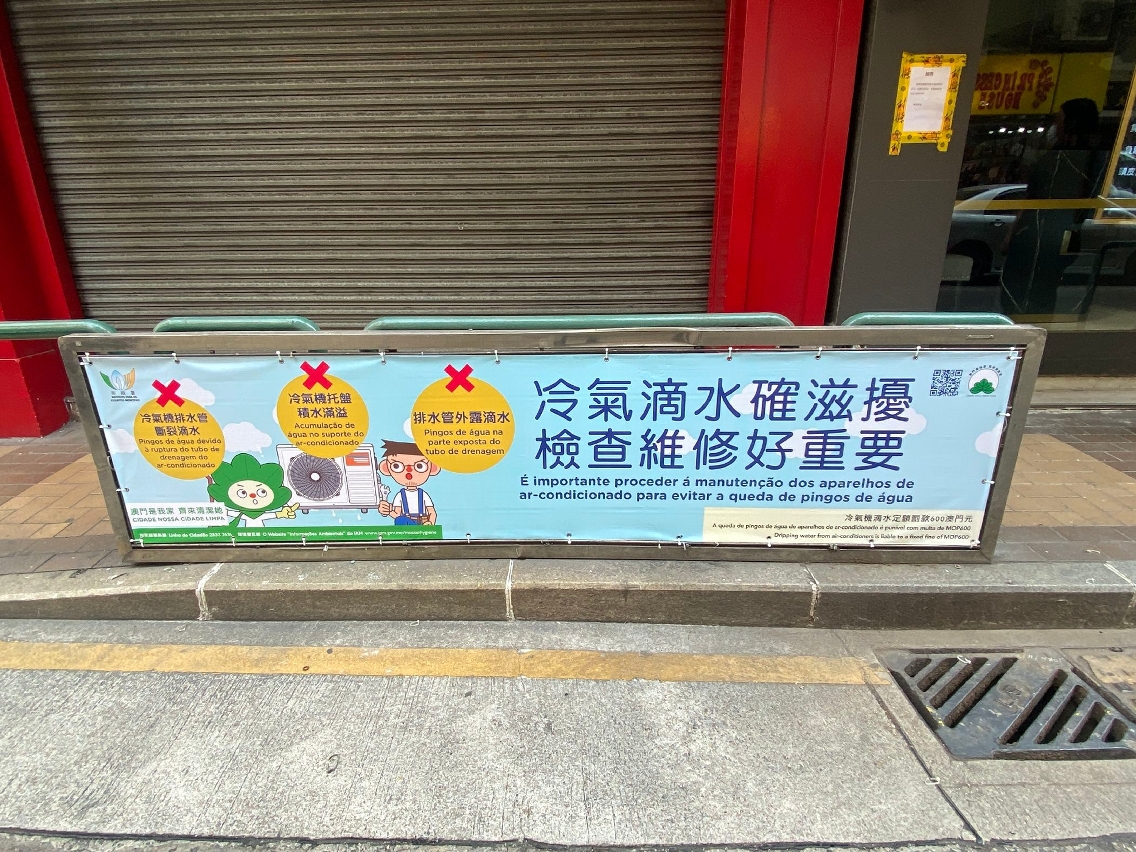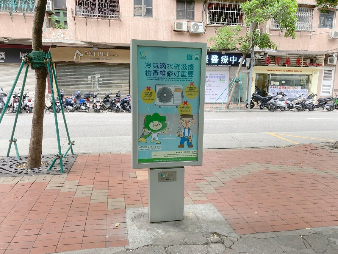 市政署亦持续向社区加强宣传,透过不同途径,如张贴海报、派发单张、安装灯箱广告及宣传横额、邀请本澳团体协助宣传、在电台播放宣传声带等,向市民宣传“预防冷气机滴水,妥善安装排水设备”的信息,又计划于电视台、巴士、的士、楼宇大堂、超市、便利店、市政署辖下设施播放宣传短片,并上载至市政署网页宣传,提醒市民注意冷气机滴水问题,主动作出改善,避免影响他人。