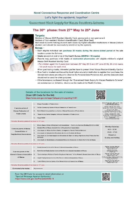 新型冠状病毒感染应变协调中心今(24)日公布,第30轮保障口罩供应澳门居民计划(下称“口罩计划”)于周四(27日)开始,售卖期间为30日,即2021年5月27日至6月25日,期间每人可一次性购买30个口罩,售价合共24澳门元。 自第30轮口罩计划起,卫生中心及卫生站停售口罩,由卫生局协议药房、本澳三个社团(工联、街总、妇联)继续提供售卖口罩服务,即全澳共有72个售卖点,服务时间详见附图。透过口罩计划购买的口罩,如有不合格或次货可退回卫生中心。