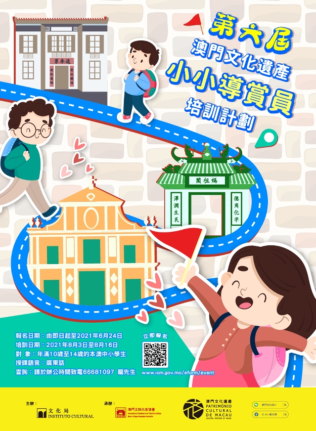 文化局主办的“第六届澳门文化遗产小小导赏员培训计划”将于8月3日至8月16日举行,并由即日起至6月24日期间招募学员,课程费用全免,欢迎年龄10至14岁的澳门在读学生积极报名参加。